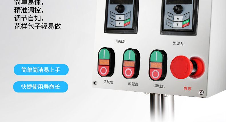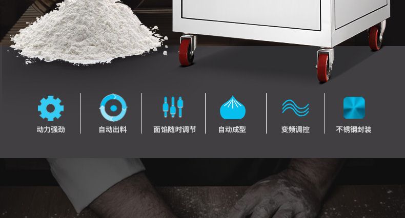 ◆ 结构合理,成型、进馅、进面与控制面板均由独立电机带动不易发生连带故障,且维修及拆装清洗方便。