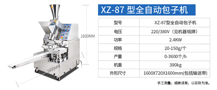 XZ-86型全自动包子机,可生产各种肉包、菜包、肉菜包、小笼包、汤包、水晶包、圆馒头、奶黄包、豆沙包、叉烧包、南瓜饼、煎堆等十几种包馅制品。适用于宾馆、饭店、学校、机关企业食堂、馒头或包子加工厂、早餐工程店及速冻食品厂等单位。可满足不同客户群体。免费提供工艺技术。免费上门培训指导安装。