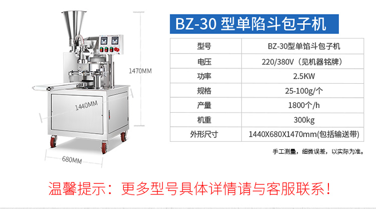 ◆包子机采用双变频控制,面、馅大小调节自如、使用方便。产品一次成型,所出产品外形大小统一、表面光滑、花纹整齐,远比手工包美观。