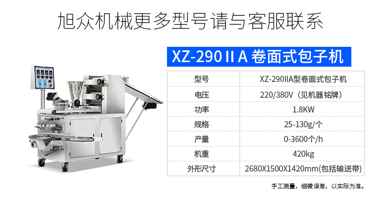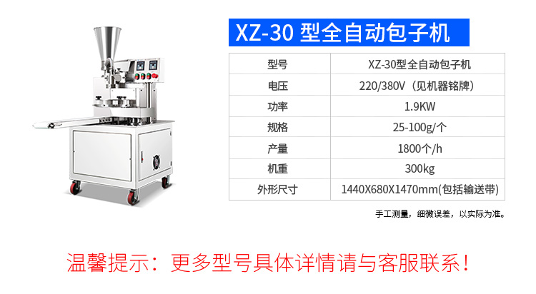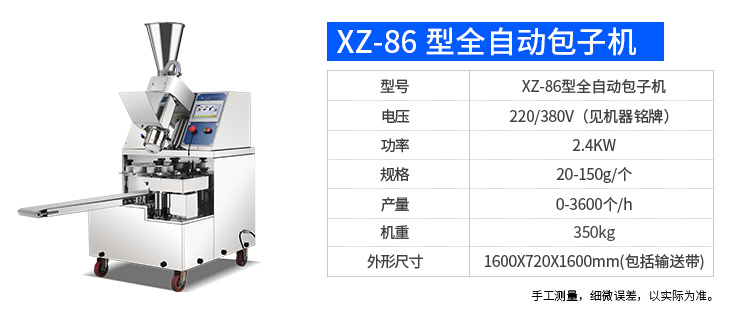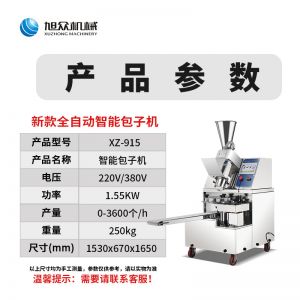 旭众牌XZ-915全自动包子机体积小重量轻,外壳及接触食品部分均由不锈钢制造,外观精美耐用;采用三变频无极变速调控,生产性能稳定。设计先进,结构简单,操作方便。包子机三大特色: