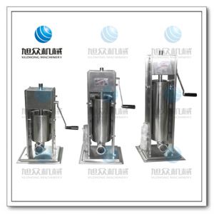 旭众牌手摇灌肠机接触食物的部位全部采用优质不钢筋材料,卫生、安全;立式设计,外形美观、大方。料筒折装快速,清洗方便;全新的齿轮系统,使送料推力,快速、轻便地释放提升推进活塞,工作效率高;此灌肠机是家用制作香肠或食堂、餐馆、酒店专业制作香肠的理想产品。