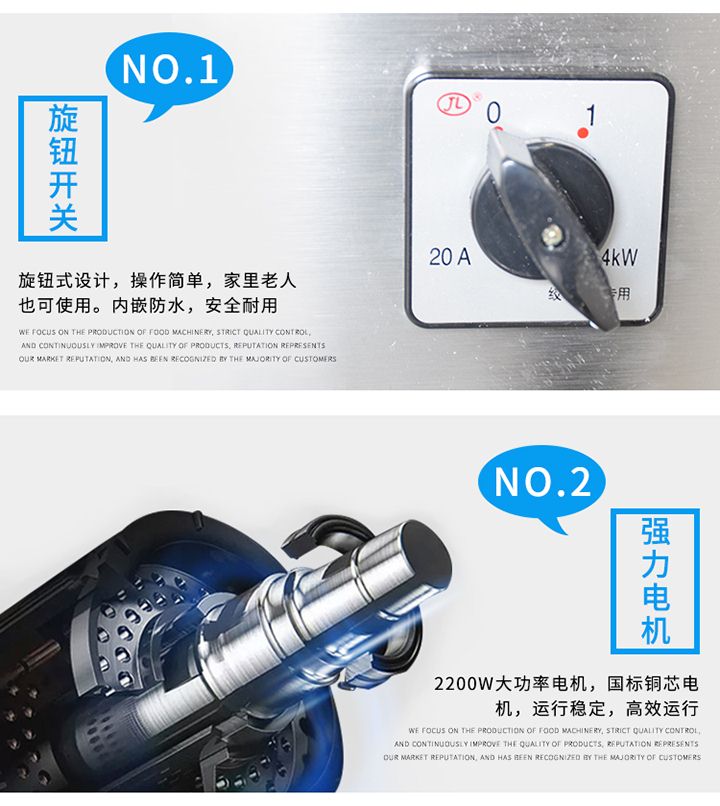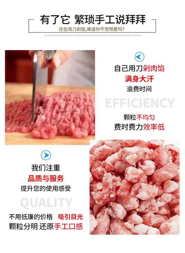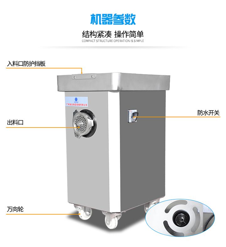 XZL-22A绞肉机吸取同行之优点,改进新型绞肉切肉机械,它能切猪肉、羊肉、牛肉、鱼及其它各种肉类、所切肉片厚度适中切片效率高,是餐厅、宾馆、酒楼、单位食堂等绞肉切肉的理想机械,该机外形独特,操作方便,维修简单,工作效率高,在同行业中处领先地位,与食物接触部分均采用不锈钢制造符合食品卫生标准。