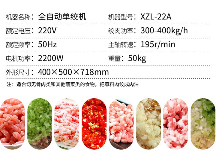 名称XZL-22A绞肉机 电源220V 功率2.2kw 产量300-400kg/h 尺寸400×500×718mm 重量50kg 规格 其他