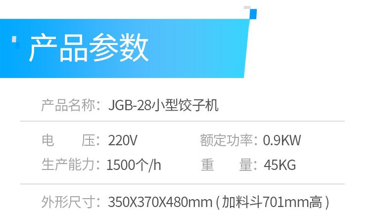 名称JGB-28型小型饺子机 电源220V 功率65W 产量0-1500个/h 尺寸350×370×700mm(加料斗) 重量45kg 规格 其他