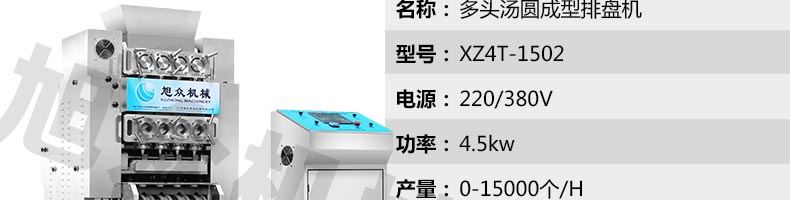 旭众牌XZ4T-1501型多功能汤圆成型排盘机是一款只要将面团放入进料口,开机便可自动搓圆、成型的设备,制品不易变形,工作效率高,相当于15-20个工人同时手工制作汤圆,并可自动排盘,真正的低投入、高收效、省钱省工。