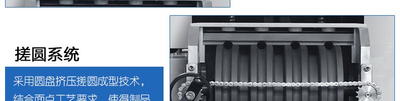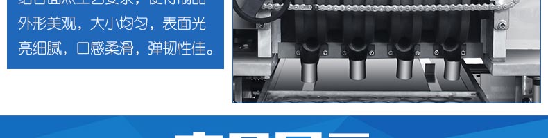 ◆采用圆盘挤压搓圆技术,结合面点工艺要求,使得制品外形美观,大小均匀,表面光亮细腻、口感柔滑,弹韧性佳;