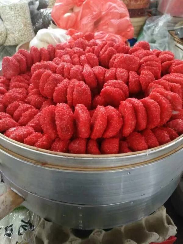 杨梅馃是用红糖、芝麻等为馅的糯米粉团子,外面粘上染红的糯米蒸制而成,蒸熟后其外表鲜红如杨梅,壁粘柔且馅香甜,里面还藏有略高于标准大气压的气体,吃的时候偶尔会有“噗哧”声。米粉点心以口感糯软为好,所以“勾(兑)”米粉就有讲究,它就是糯米粉与“早米粉”的搭配比例,如果糯米粉过多,虽然口感好但难以制作成“馃”。如果糯米粉过少,虽然制作容易但影响口感。