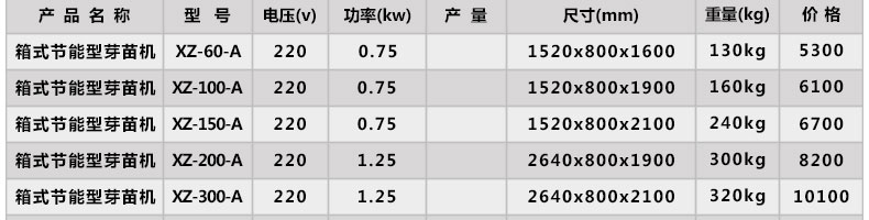 型号工作电压耗水量日耗电(度)功率育苗箱重量外形尺寸