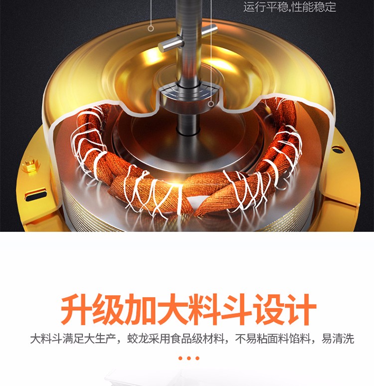 5.料斗加大,蛟龙采用高品质食品级PP材料,不粘面料、馅料,易清洗;
