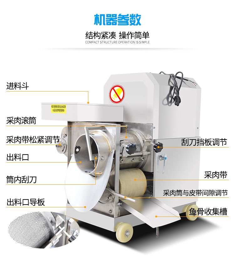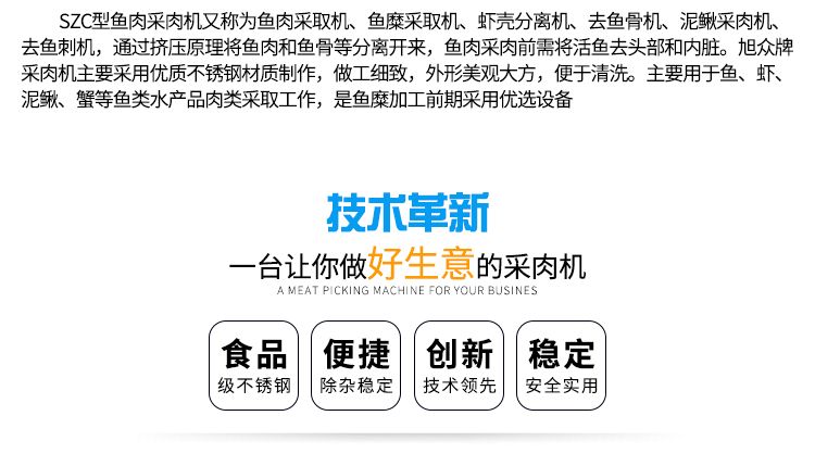 旭众XZC系类鱼肉采肉机是一款专业加工鱼肉去刺、蟹虾去壳的机械,由于随着市场的发展,人们生活中渐渐离不开有鱼的生活,无论是家里、饭店等鱼都是主要的食物还有现在一些休闲食品中都是离不开鱼加工后的鱼泥。鱼肉采肉机的研制成功给人们生活中带来很多方便,无论是您做鱼丸、鱼馅等只需要一款鱼肉采肉机就可以实现,对于大量生产即降低了人工成本,又提高了生产效率。