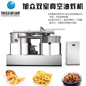 ●双室采用上下两个罐,脱油时确保绝对无回油,使含油、含水率低。油炸、脱油、脱水、油过滤一体化设计,在真空下连续性完成,产品含油量低,产品处于负压状态,在这种相对缺氧的条件下进行食品加工,可以减轻甚至避免氧化作用(例如脂肪酸败、酶促褐变和其他氧化变质等)所带来的危害。在负压状态,以油作为传热媒介,食品内部的水分(自由水和部分结合水)会急剧蒸发而喷出,使组织形成疏松多孔的结构。